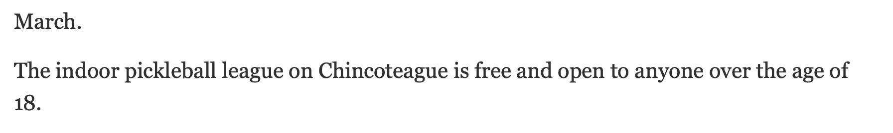 As you can see from the article below pickleball has been growing on Chincoteague Island since its introduction in January 2016.